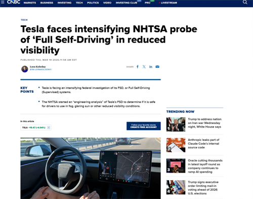 【顶端】近期,美国国家公路交通安全管理局(NHTSA)升级了对特斯拉“完全自动驾驶”(FSD)系统的调查,直指FSD在雾天、强光等低能见度路况中,存在摄像头无法有效检测异常、预警滞后等安全隐患,可能涉及召回美国市场超320万辆车辆。