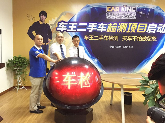 随后,车王郑州店总经理赵鹏、检测经理杨博、渠道经理王红群按动车王二手车检测项目启动水晶球,标志着车王检测产品迈入新纪元。
