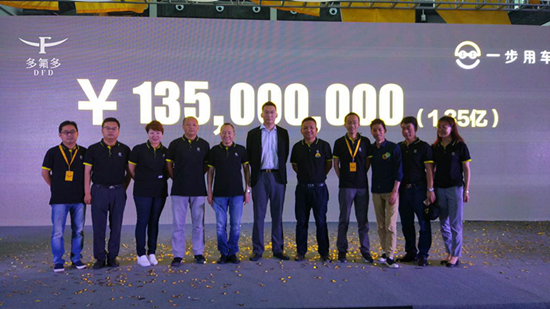 (图为一步用车创始团队与投资方多氟多集团领导(中)签约现场合影)