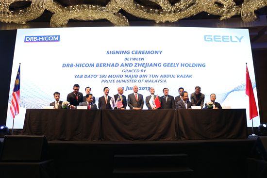 马来西亚总理纳吉布、中国驻马来西亚大使黄惠康、国际贸易与工业部第二部长黄家泉、财政部第二部长佐哈里、马来西亚中国特使黄家定、吉利集团董事长李书福、吉利集团总裁安聪慧、DRB-HICOM集团董事长哈吉·莫哈末卡米尔、DRB-HICOM集团总裁萨义德出席了签约仪式,并见证了签约。