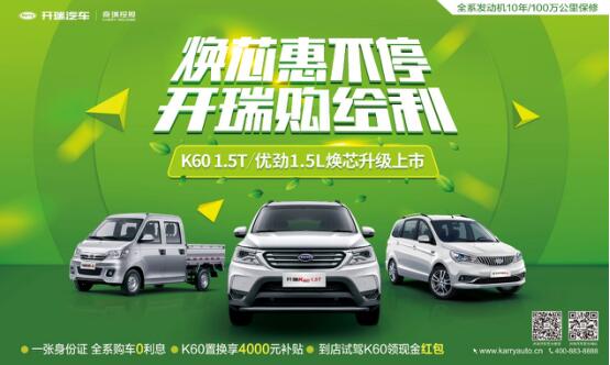 开瑞汽车推出“焕芯惠不停 开瑞购给利”福利,期间K60 1.5T、优劲1.5L焕芯上市,成为市场中最火爆的车型之一,近日四重钜惠即将临近尾声。
