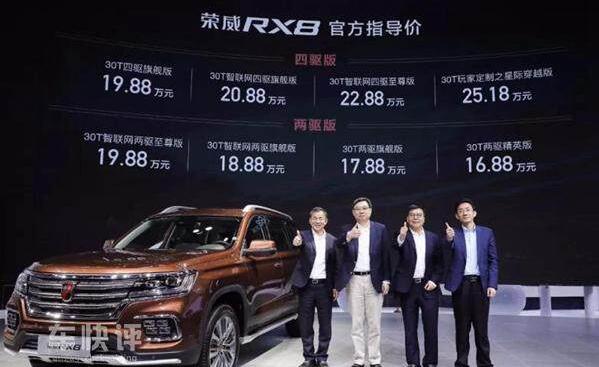 也许是看到传祺GS8的成功,再加上小弟荣威RX5的畅销,终于在2018年的北京国际车展上,荣威RX8正式上市,售价区间在16.88-25.18万之间。在尺寸方面,荣威RX8长宽高分别为4923/1930/1810(带行李架为1840)mm,轴距为2850mm。外观采用家族式设计风格的荣威RX8从外观上看还是十分大气,线条较荣威RX5显得硬朗了许多,大面积金属镀铬条的使用,让整车看起来高级感十足。在内饰用料做工上,荣威RX8也可谓下足了功夫,实木和镀铬金属条的使用,再加上大中控、大方向盘和大档把的衬托,都彰显了荣威RX8不凡的品质。毕竟价格在那放着,不这么搞,消费者怎么会买账?