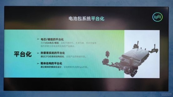 电池方面的亮点同样是电池包的平台化,通过电芯模组、热管理系统、箱体结构的平台化,来实现不同电量的快速开发。