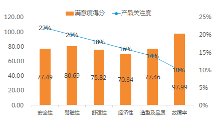 具体来看,产品满意度对综合满意度的影响仍然占决定性作用,汽车消费者对于汽车产品本身的要求依然很高。六个指标中,产品满意度得分由高到底依次为:故障率、驾驶性能、安全性能、外观及品质、舒适性、经济性,随着车辆质量的不断提升,车身故障率逐年降低,用户对故障率满意度较高,随之关注度有所降低。
