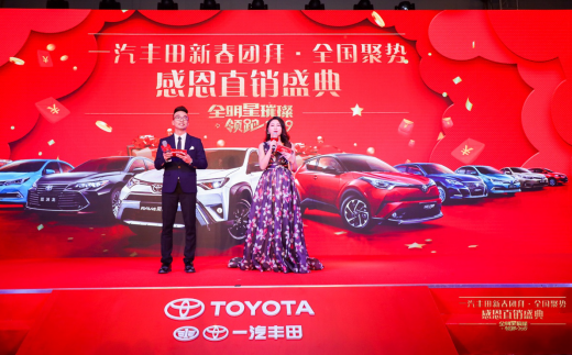 在2019年春节即将来临之际,一汽丰田汽车销售有限公司(以下简称“一汽丰田”)于1月12日举办了“领跑2019,新春团拜·感恩直销盛典”活动,该活动以广州(华南大区)为主会场,并与其它6大区的分会场同步进行,同时,遍布全国的630家一汽丰田经销店,亦给到客户年末购车钜惠福利。