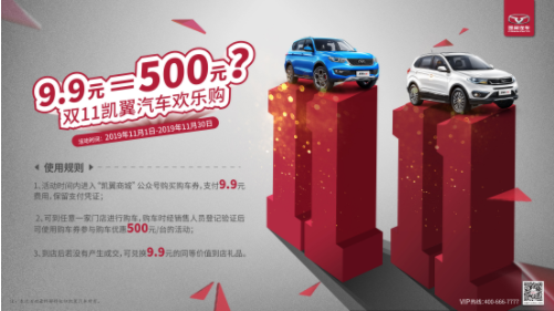 凯翼汽车震撼推出“双11凯翼汽车欢乐购”活动,消费者可通过关注官方公众号或扫描二维码等方式进入凯翼商城,仅需支付9.9元,就可购得500元购车券,用于抵扣线下任意4S店的购车费用。即使消费者不购车,礼券也可以在4S店用于换取等值礼品。凯翼汽车双11不搞噱头不玩套路,让消费者真实体验凯翼汽车优越品质和贴心化的服务同时,实实在在享受到价格上的福利。