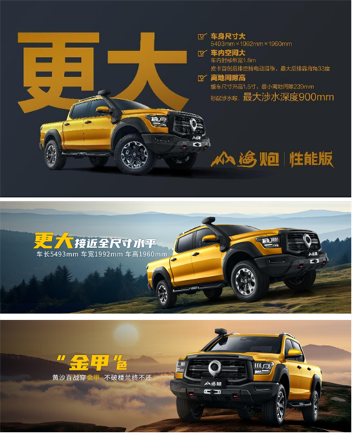 更大,以极致定义宽体皮卡。山海炮性能版车长达5493mm,车宽近2米,接近全尺寸皮卡。首次采用铿锵靓丽的“金甲”专属车身颜色,象征勇于挑战、不断突破的越野精神,体现中国皮卡进击全球、剑指前三的勇气与实力。
