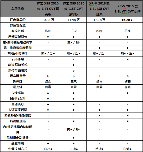 可以说绅宝X55与XR-V都是精品中的佳作,一款是自主新宠、一款是合资的优秀代表。而且绅宝X55和XR-V的各项指标相仿,都是冲击品质的优质车型,但从价格上来讲,绅宝X55的价格优势明显,无疑是自主品牌的高品质之作。