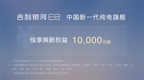 12月16日,吉利银河E8已正式开启预售,预售价格18点8万元起,下订用户同时可享受订金膨胀权益,至高抵扣6000元,2024年2月29日前下订客户还可享有悦享焕新权益。