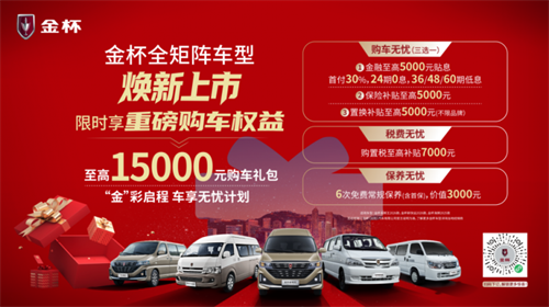 为了让用户轻松拥享新品,金杯还推出了针对金杯海狮王2026款、金杯新快运2026款及金杯海狮2025款车型的“金”彩启程车享无忧计划。该计划包括“金融购车、旧车置换、保险支持”三大核心权益,用户可任选其一,享受更具性价比的购车方案。其中,金融政策首付3成起,可享无息或低息贷款;旧车置换补贴至高5000元;保险补贴至高5000元;此外,购车用户还可叠加享受至高7000元的购置税补贴与价值3000元的免费保养服务。整体价值1.5万元的权益包,让用户从购买到用车全程省心省力,开启高效创富之旅。微信扫描小程序码,即刻下订,解锁更多惊喜!