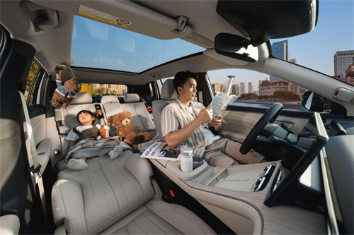 舒适配置也能照顾全家老小。前排座椅配置堪称奢侈,前排配备8点式按摩功能,支持通风、加热与记忆。方向盘加热,让北方用户在严冬也有手心里暖暖的幸福。后排靠背支持137度无级调节,配合承重10公斤的小桌板,瞬间变为舒适休息区。2.26㎡全景天窗加电动遮阳帘,观景晒不黑,遮阴更凉爽。空调配置也能满足南北用户的刚需。创新的双叶轮空调箱设计,不仅保证风量,工作噪音也更低,夏天暴晒后也能快速降温,降至舒适温度的时间要比同级快4分钟。到了冬天,双层流热泵空调可实现热风暖身、凉风提神、干风吹窗,既保证制热效果,又能给驾驶员提神,还能防止车窗起雾影响驾驶。