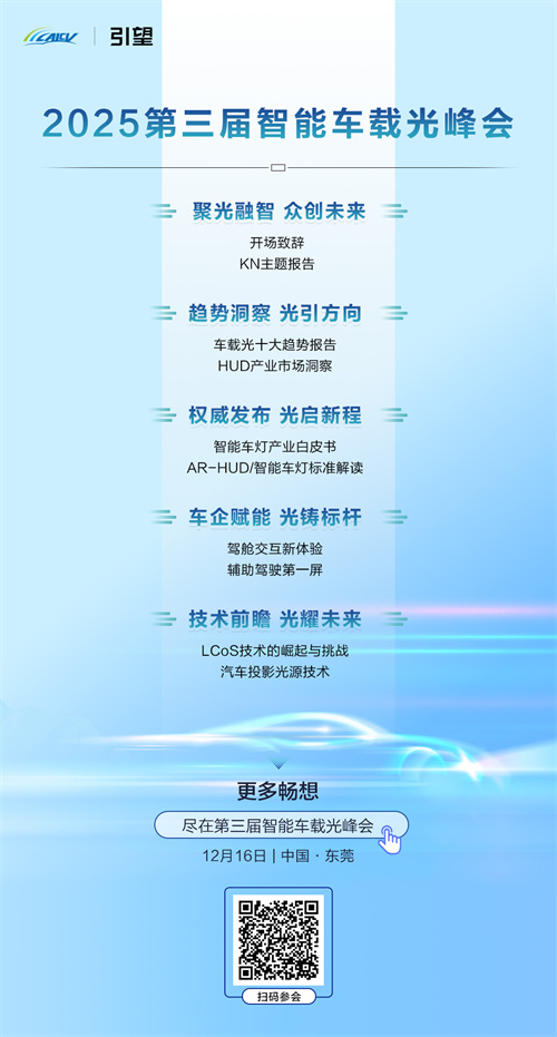 以“聚光融智 众创未来”为主题的2025第三届智能车载光峰会,将于 12 月 16 日在东莞正式召开。本届峰会由中国智能网联汽车产业创新联盟主办,将汇聚行业专家、科研院所与车载光领域顶尖企业,共同探讨车载光技术的创新突破与产业化路径,为中国智能汽车产业的高质量发展注入新动能。