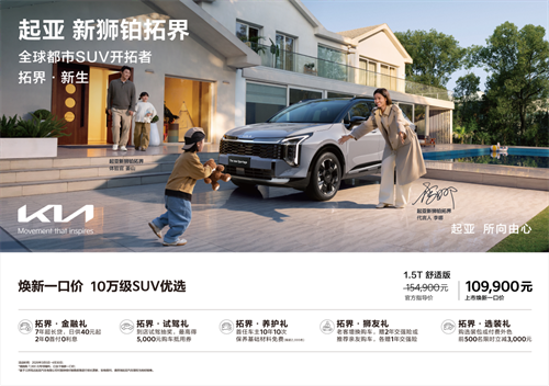 经典焕新,传奇再续。2026年3月5日,起亚新狮铂拓界正式上市,共推出7款车型,并在中国首次提供X-Line专属运动设计包,官方指导价15.49万元-21.79万元。为回馈广大中国用户的信赖,即日起至4月30日,消费者购车即享全国统一“焕新一口价”10.99万元起!同时还可享金融礼、试驾礼、养护礼、狮友礼、选装礼5大尊享礼遇。