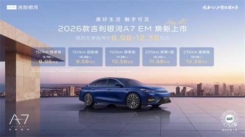 吉利银河A7提供“纯电+电混”双能源形式布局,满足多元化的用户需求,其中,2026款吉利银河A7 EM上市限时先享指导价8.98万元起。