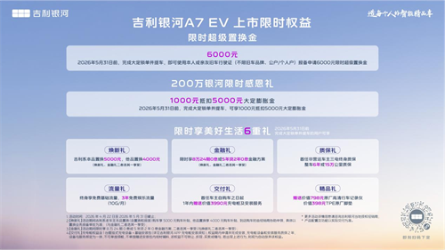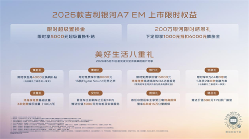 即日起,用户可通过吉利银河APP、微信小程序、抖音小程序及官网等官方渠道下定。凡在2026年5月31日前下定2026款吉利银河A7 EM的用户,可享受5000元超级置换金及1000元抵4000元膨胀金。