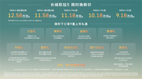 为了让这份“全球严选”触手可及,长城欧拉5推出了极具诚意的上市政策:新车建议零售价区间为9.98万至13.38万元。更为惊喜的是,即日起至2025年12月31日,用户下订并锁单,即可尊享限时换新价9.18万元起(含至高5000元以旧换新补贴)。此外,购车还可享受包含订金礼、新潮礼、智行无忧礼在内的9重上市好礼。针对全系车型(480km Air版除外),在2025年12月31日(含)前完成下订并锁单的用户,非客户原因导致车辆在2026年1月31日(含)前开票交付,更可享跨年购置税补贴 。
