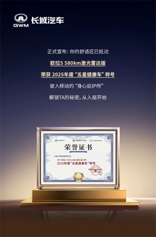 近期,长城欧拉5荣获中汽研—汽车健康联合研究中心颁发的2025年度“五星健康车”称号。在严苛评测中,欧拉5几乎做到“零苯零醛”,并拥有超99%的抑菌率与超95%的驱螨率,配合15.6英寸“莱茵三重护眼认证”中控屏,为用户构筑起呼吸与视觉的双重健康防线。