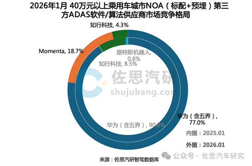 40 万元以上高端市场对辅助驾驶系统的上限要求更高,通常配备高端辅助驾驶硬件,是技术实力、系统融合能力的重要体现。即便在竞争加剧、技术实力较强的部分厂商份额持续提升的背景下,华为乾崑仍以 77.0% 的市占率持续稳坐头部,保持稳固地位,成为高端车型辅助驾驶方案绕不开的选择。